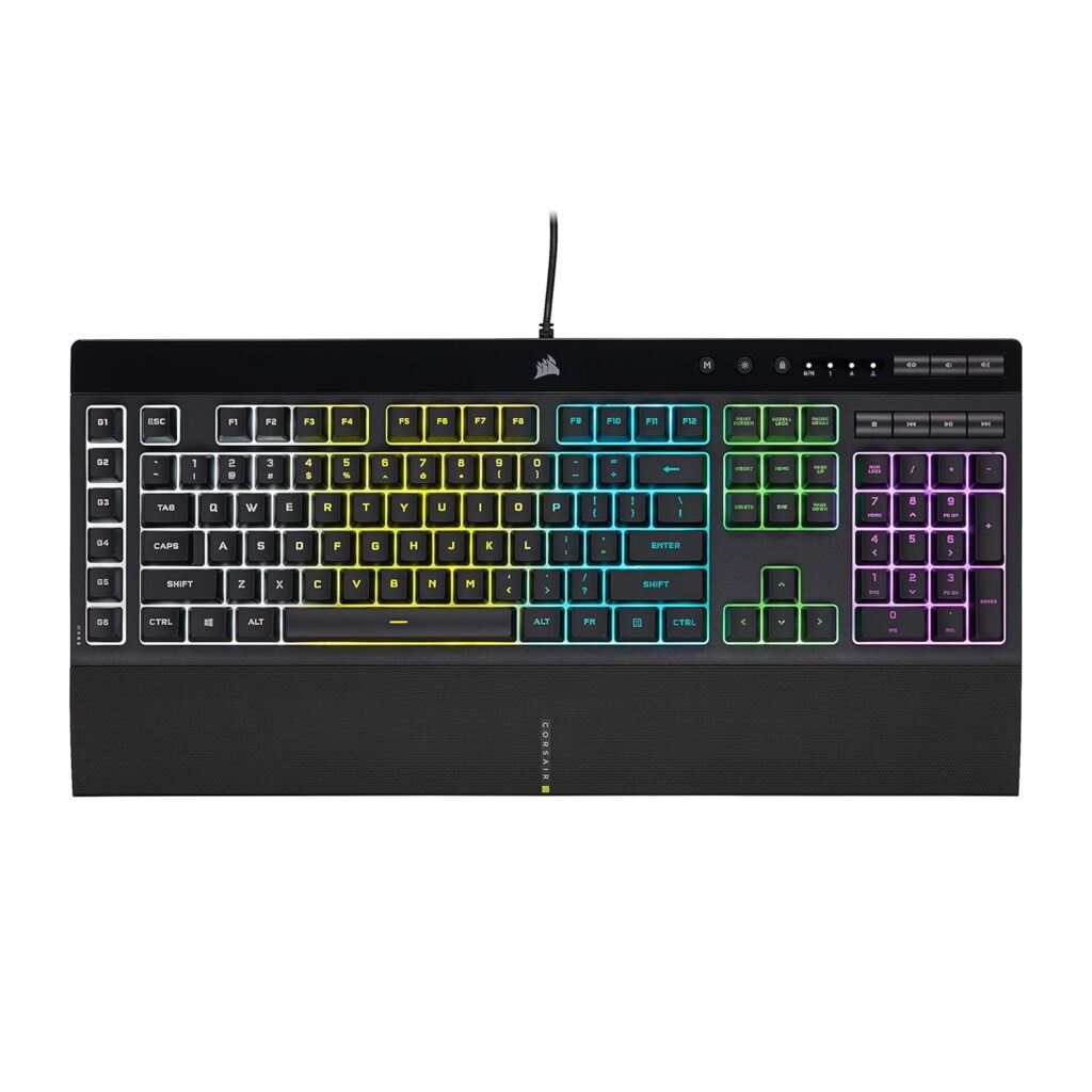 Best Overall: The Corsair K55 RGB Pro strikes the optimal balance between features, performance, and value. Its combination of programmable macros, five-zone RGB, spill resistance, and comfortable design makes it suitable for diverse gaming genres and use cases. At around $50, it delivers exceptional value without significant compromises.